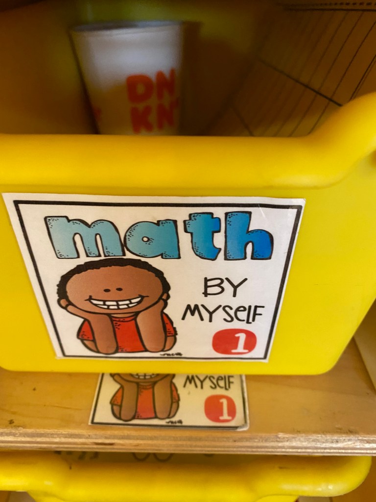 I also have a display case where student can easily find & retrieve their writing journals and math journals (in the first large picture, on the back wall under the W & X). I use different “center” bins organized around the room for easily access to Math by Myself, Math with Someone, Word Work Activities and Puzzles.