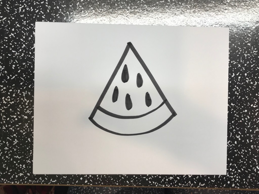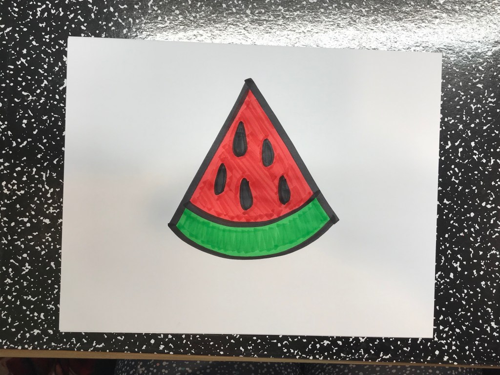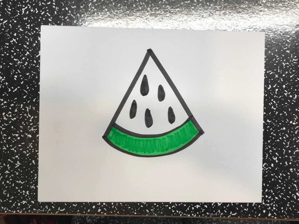 Then I would ask the students: Does your watermelon picture need to look like my watermelon? Some will say yes, some might say no. But I correct them with: No! It doesn’t have to look like my watermelon, you can make your watermelon look however you’d like. Sometimes I see watermelons like a giant smile, sometimes I see the whole watermelon, and those things are big! I do want you to focus on adding details to your picture so you can make it look as close to a real watermelon as you can!