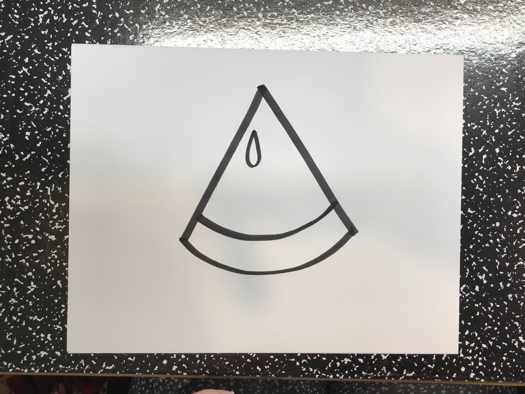 It kind of looks like a pizza right now, so I need to add the seeds the come in a watermelon. The black ones. So I’m going to draw a tear drop shape. So I start at the top, draw a little line down, make a smile line then go back to touch the line.