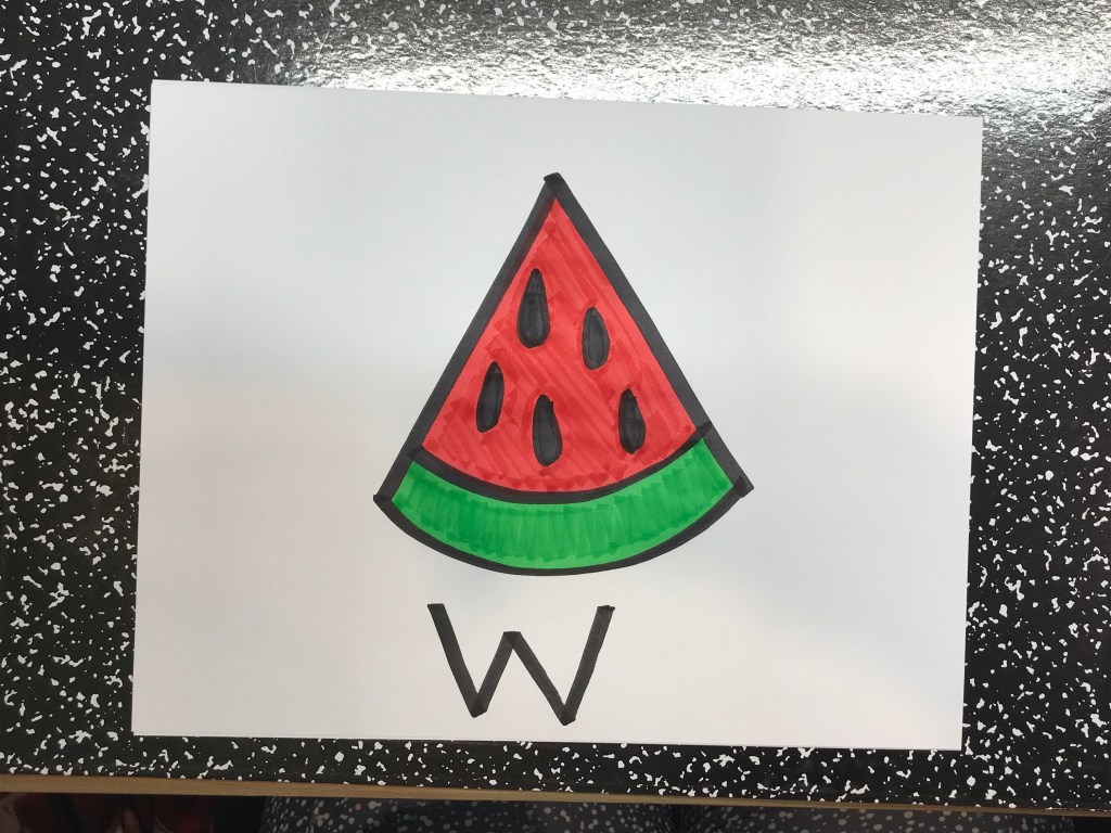 I then add that sometimes when people draw pictures they also use letters and words to tell people what they draw. So for our picture we could label it watermelon. Does anyone know what sound watermelon starts with? (Then I would say the world by stretching it out… wwwwwwwwatermelon). They usually have some guesses (this helps you have a quick understanding of who already has the beginning letter skills). I would add a W and then encourage students to also add their label of W to their watermelon so they can share what their picture is for everyone who is going to see it.