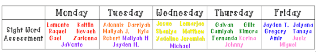I assess students on a weekly basis, I do this for consistency. I create a list of students I am going to assess each day, and then that is their designated day. Here’s an example of my schedule (it says Sight Word Assessment… but I do Letter/Sound Assessment first, then transition to my Sight Word Assessment when the student is ready – aka they know all their letters & sounds!) Fair Warning: This schedule was when I had 36 students in my classroom… and the colors of the students names were based on what Reading Group they were currently in – that way I could pull them during their Reading Group time OR during another free minute I had during the day… some times I didn’t get to pull them until Play Time at the end of the day, but I made sure to pull them at some point!
