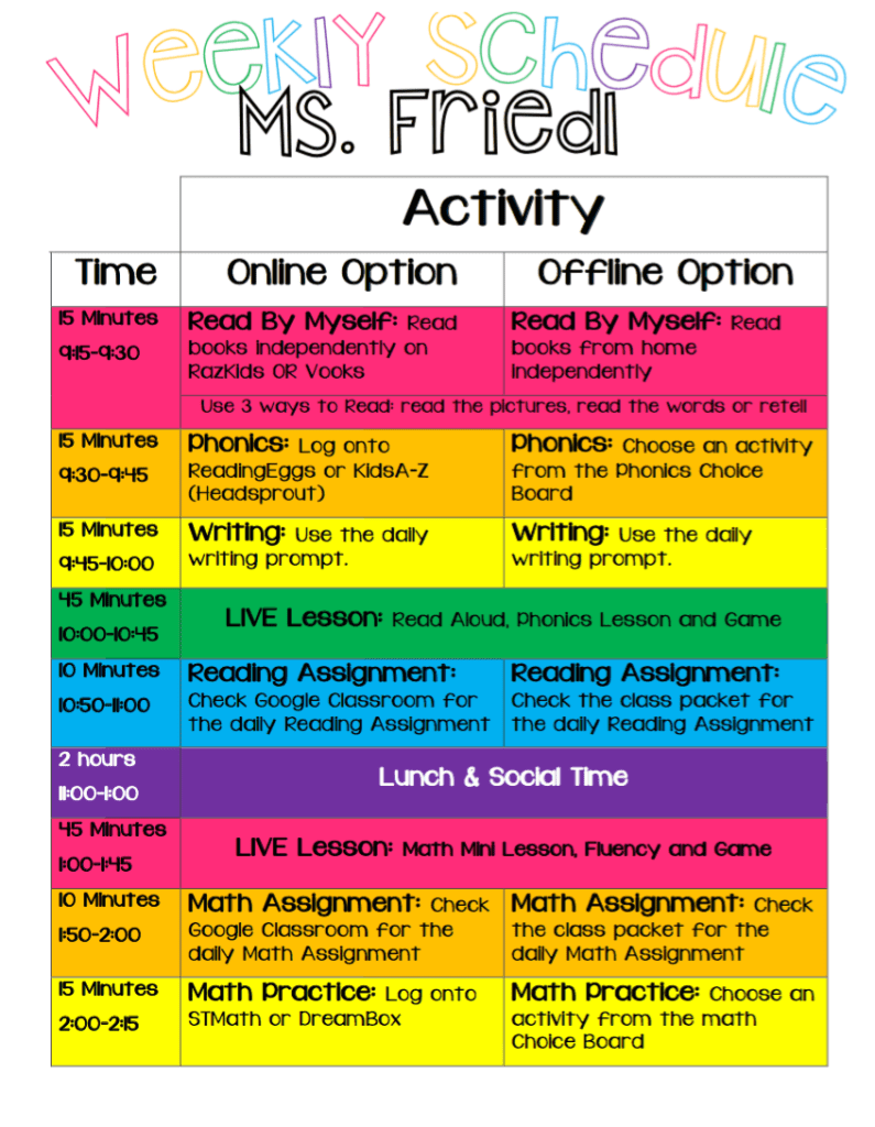 While this school year I am unsure what “school” will look like for me and my students, this gives you some ideas on what your schedule could look like. I really liked giving my families options of Online and Off Line ideas on what to do for each portion of the day.