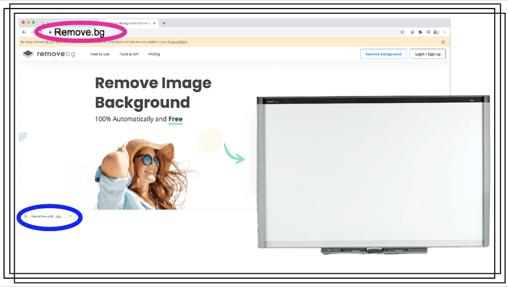 BUT the Smart Board that I liked still had the checkered background… no worries, there is an easy solution to this problem! Remove the Background: First you need to download the image you want that has the background (I just downloaded it and left it waiting to be opened at the bottom of my screen (blue) so that it was easy to find/drag to where I needed. Then I opened another tab at the top of my browser and went to the website: Remove.bg I dragged the photo (blue) right to the UPLOAD button right on their home page.