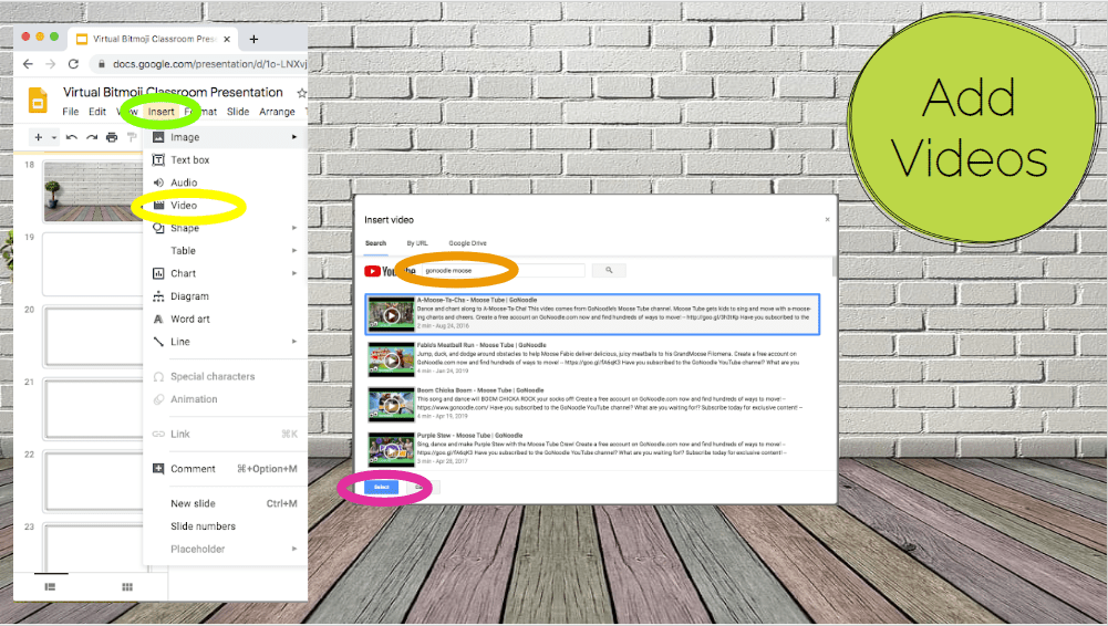 If you want to Add EMBEDDED Videos (that means the kids will SEE the video right in your classroom, not a link to bring them to another website, etc.) it is SUPER easy! Go back up to the top of your Google Slide, click Insert (green), then Video (yellow) and menu will pop up, you have 2 options from here: #1 use this pop up to search for what you’re looking for using some key words (I search: GoNoodle Moose & I was looking for the Moose-ta-cha, which ended up being the first choice, win!) OR #2 you can find the video you want on youtube & just copy & paste the link into the search board on the pop up & get the EXACT video you wanted. Either way works great! Then just click Select (pink) when you found what you want!