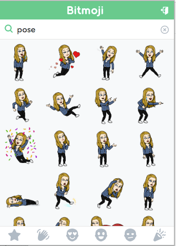To add your Bitmoji to your classroom (after you’ve created it), just click the Bitmoji icon, then your Bitmoji menu will pop up. You can either search Bitmoji for a specific thing you’re looking for (i.e. mustache, waving, reading, etc) or you can scroll down to see what is popular right now and get inspired! At the bottom of the Bitmoji menu there is a Star (for popular Bitmoji poses), a waving hand (for Bitmojis saying Hi), Heart Eyes (Love Bitmojis), Smile (for Happy Bitmojis), Meh Face (for tired, unhappy, stressed Bitmojis), Celebration (for celebrating!). You can use this to help guide your searching.