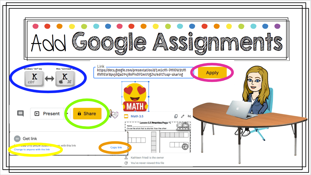 If you want to Add a Google Assignment to your Virtual Classroom, you’ll first have to create the Google Slide or Google Doc that you want to link to (your assignment). Once you do that, on your assignment page you’ll click SHARE (green) on the upper right corner. A box will pop up, make sure your settings allow anyone with the link to access the page (yellow). Otherwise you are going to be bombarded with a million emails requesting access! Then copy the link (orange). Then you’ll going back to your Virtual Classroom, click on the image you want to link the assignment to – in this case I chose a Math Emoji. You’ll ctrl K (PC) or control K (Mac) (blue), paste the link to the assignment in the Link box, then click apply (pink). Then when you hoover over the Math Emoji, it will show a preview of what the assignment is (example is: Math 3.5).