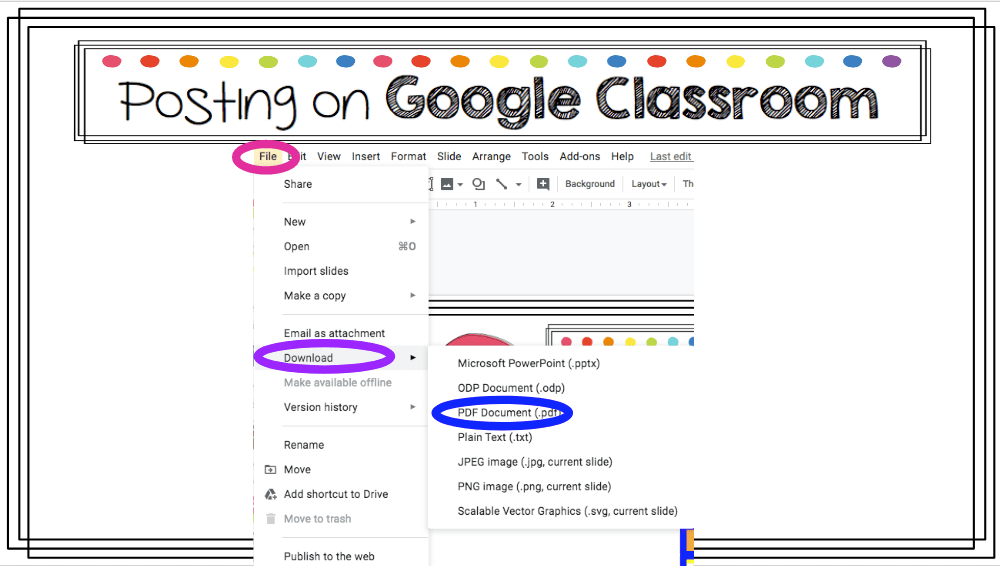 The FINAL and MOST IMPORTANT thing to do is to SHARE your finished Bitmoji Classroom so that your students can use it!! There are a few ways to do this. You can download it as a PDF (the links will all still work! Yay! And students will not be able to Move anything around, which is also a BIG YAY!!). File (pink), Download (purple) then PDF Document (.pdf) (blue).