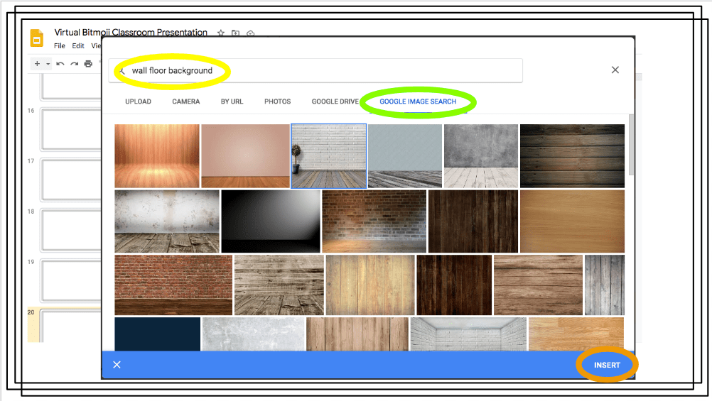 Then you will search: Wall Floor Background (yellow), make sure your search is on Google Image Search (green), find the image you would use, then click insert (orange):