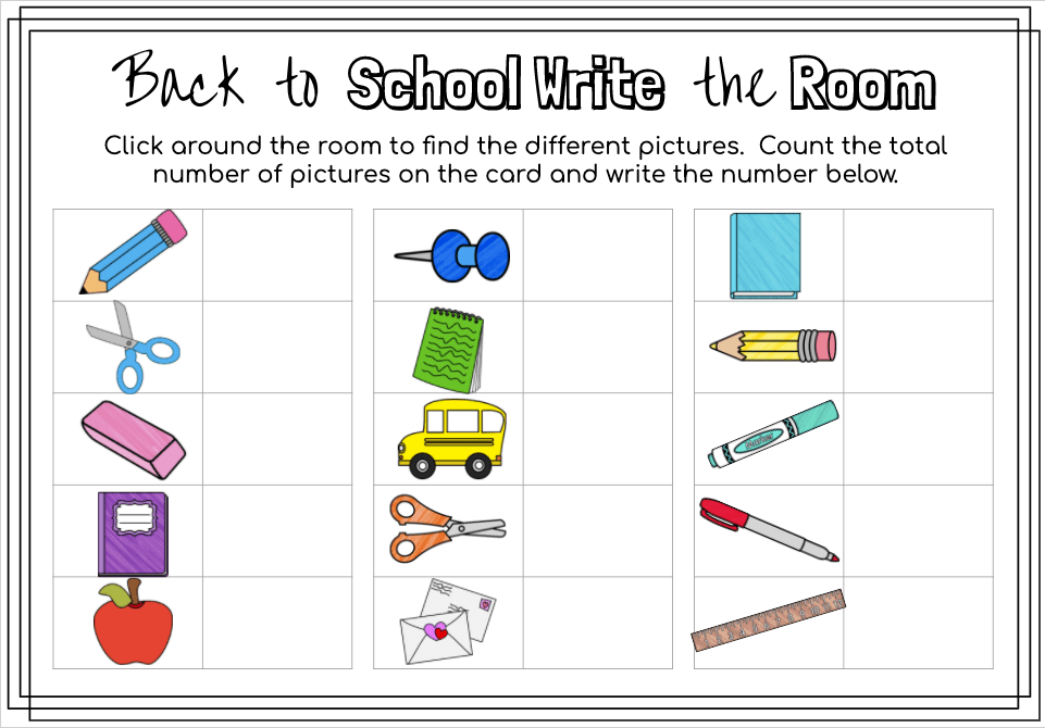 #3 – All Virtual: Use this fully virtually – Publish the Slide to the Web (if you need help click here), then have students either virtually fill out the form by click inside the table next to the corresponding picture and typing in their answer (or they can print it out). The pictures are on a clickable slide that will bring the student to the correct slide to “explore the room” and count.