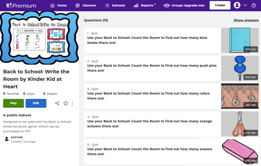 Students would use the virtual classroom (pictured above) to click on the objects to bring them to the specific slide with the amount of items on it. Then they would count & record their answers (either in the answer sheet document or on Kahoot!)